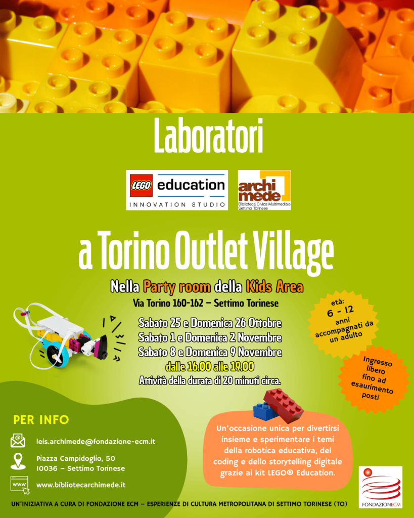 Presso la Party Room di Torino Outlet Village ti aspettano i laboratori LEGO® Education condotti dai trainers Leis della Biblioteca Archimede.